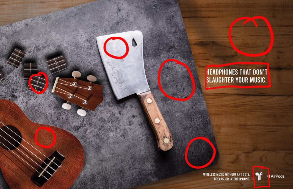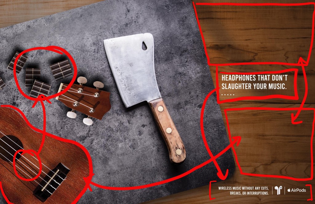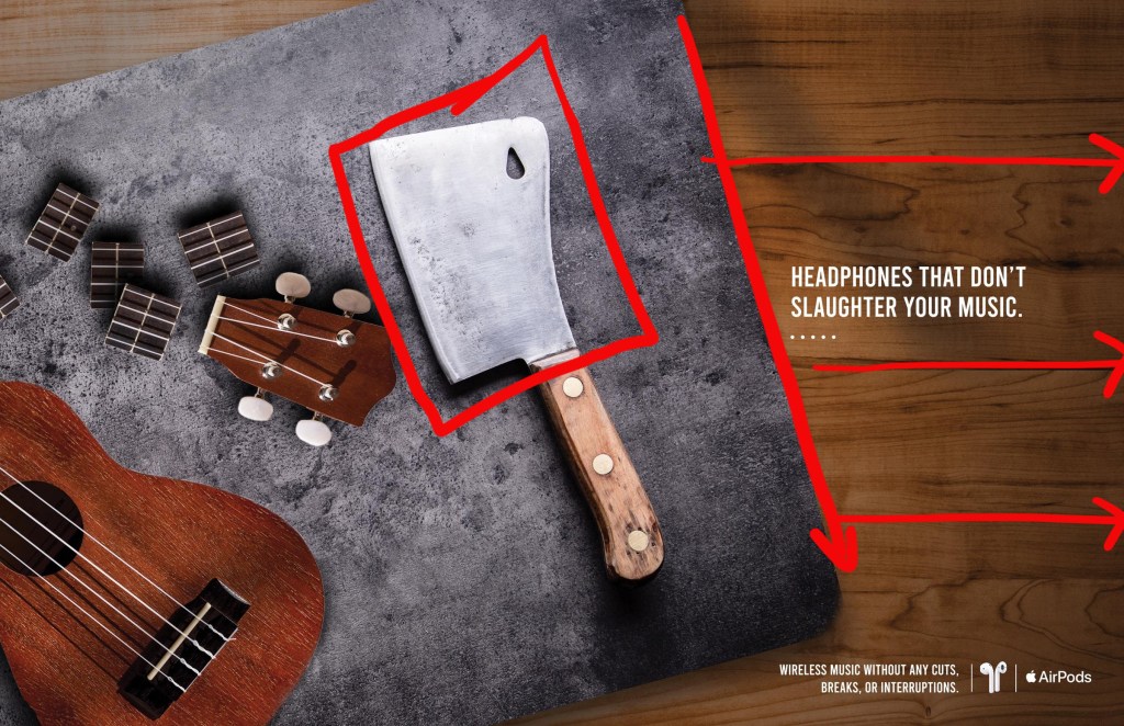 In this ad, textures are repeated, typeface is repeated, color is repeated and negative space is repeated. Starting on the left side of the ad, the strings on the ukulele are repeated in the cut up neck pieces. The ukulele chosen to be used is wood, which is the same texture that is used in the background of the entire ad. In the background, there are is a similar amount of space between “Headphones that don’t slaughter your music”, the top of the page, and the description at the bottom of the page along side the image of AirPods and the Apple logo. The text use the same font family which also created good unity. They feel like they belong in the same ad. Those texts are also white, similar to the almost white color on the blade. This also repeats in Apple’s logo and the color of AirPods they chose to feature in this ad.