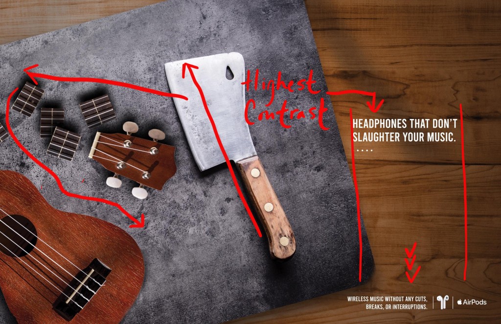 The elements in this ad are strategically placed to create a visual path for the viewer’s eyes to follow. The highest point of contrast will be either the white text (Headphones that don’t slaughter your music) on the wooden table or the blade on the cutting board. From either point we can follow the angles down to the white text in the bottom right corner or follow the lines the ukulele neck has created and then down the body of the ukulele back to the text in the lower right corner. The blade of the knife is also facing the ukulele and the chopped up pieces which points our eye in that direction. The blade is also in the center of the page horizontally and vertically. The white text is horizontally centered as well. This is another reason that it will most likely be the first element the viewer sees.